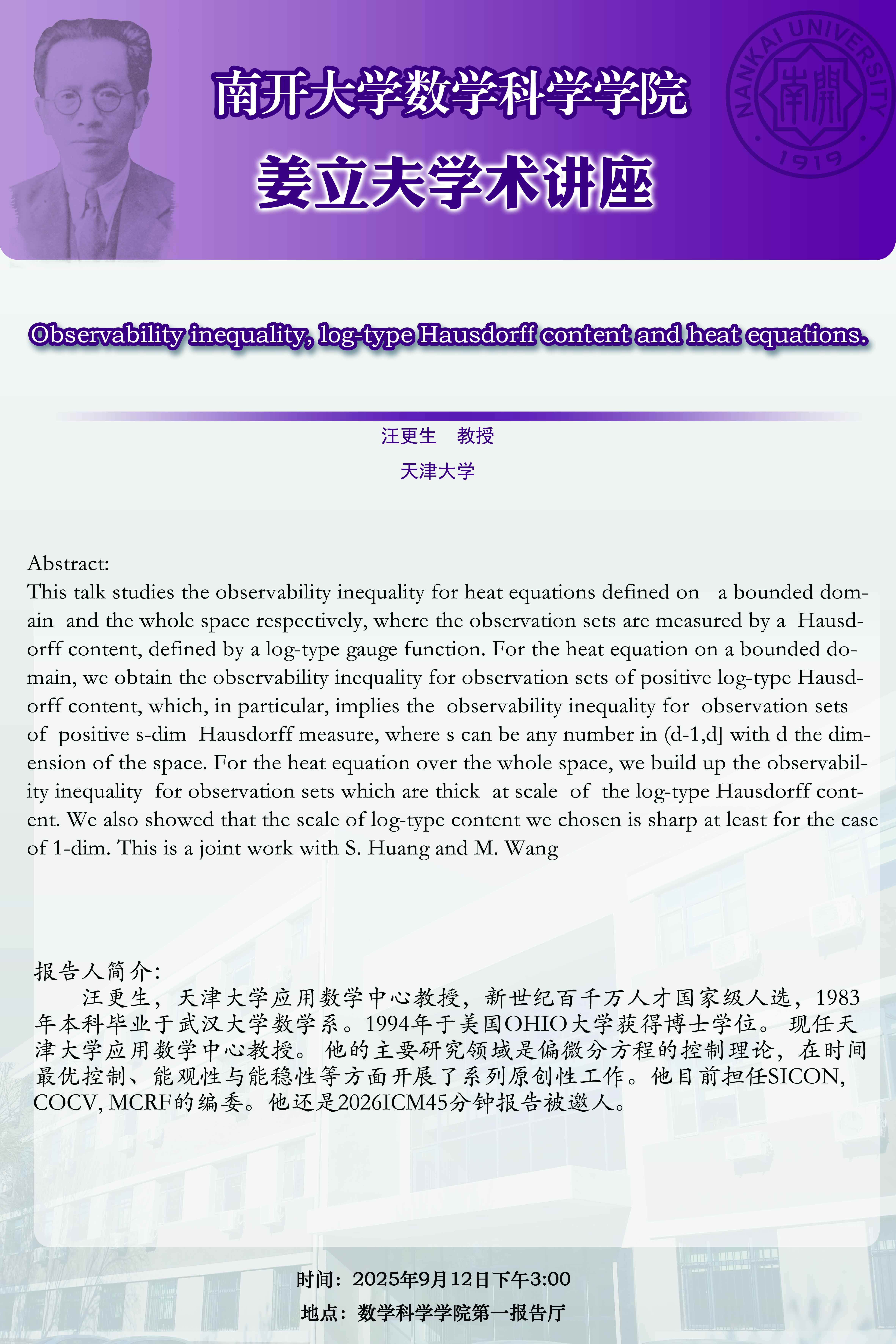【姜立夫学术讲座】Observability inequality, log-type Hausdorff content and heat equations.