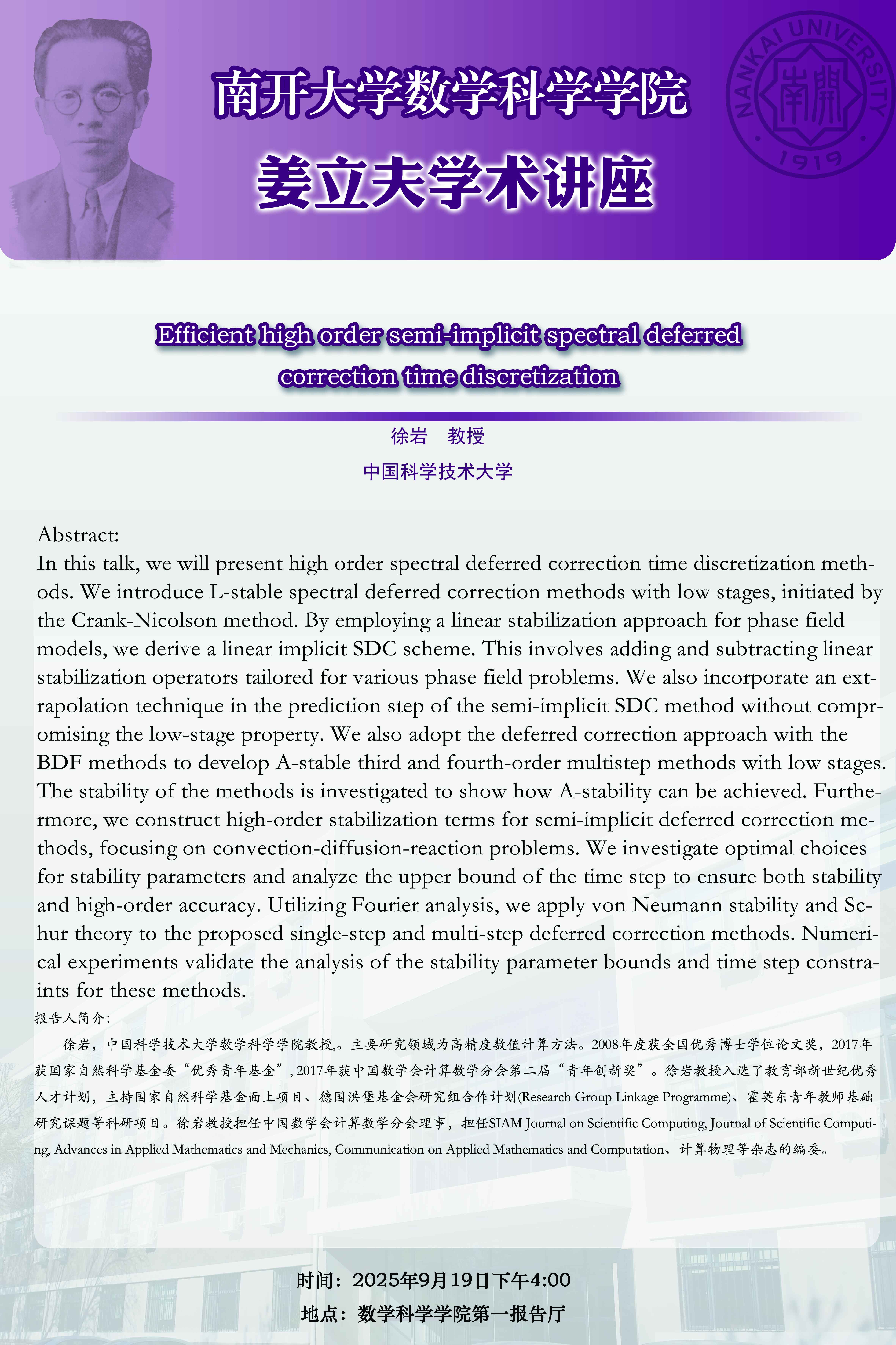 【姜立夫学术讲座】Efficient high order semi-implicit spectral deferred correction time discretization