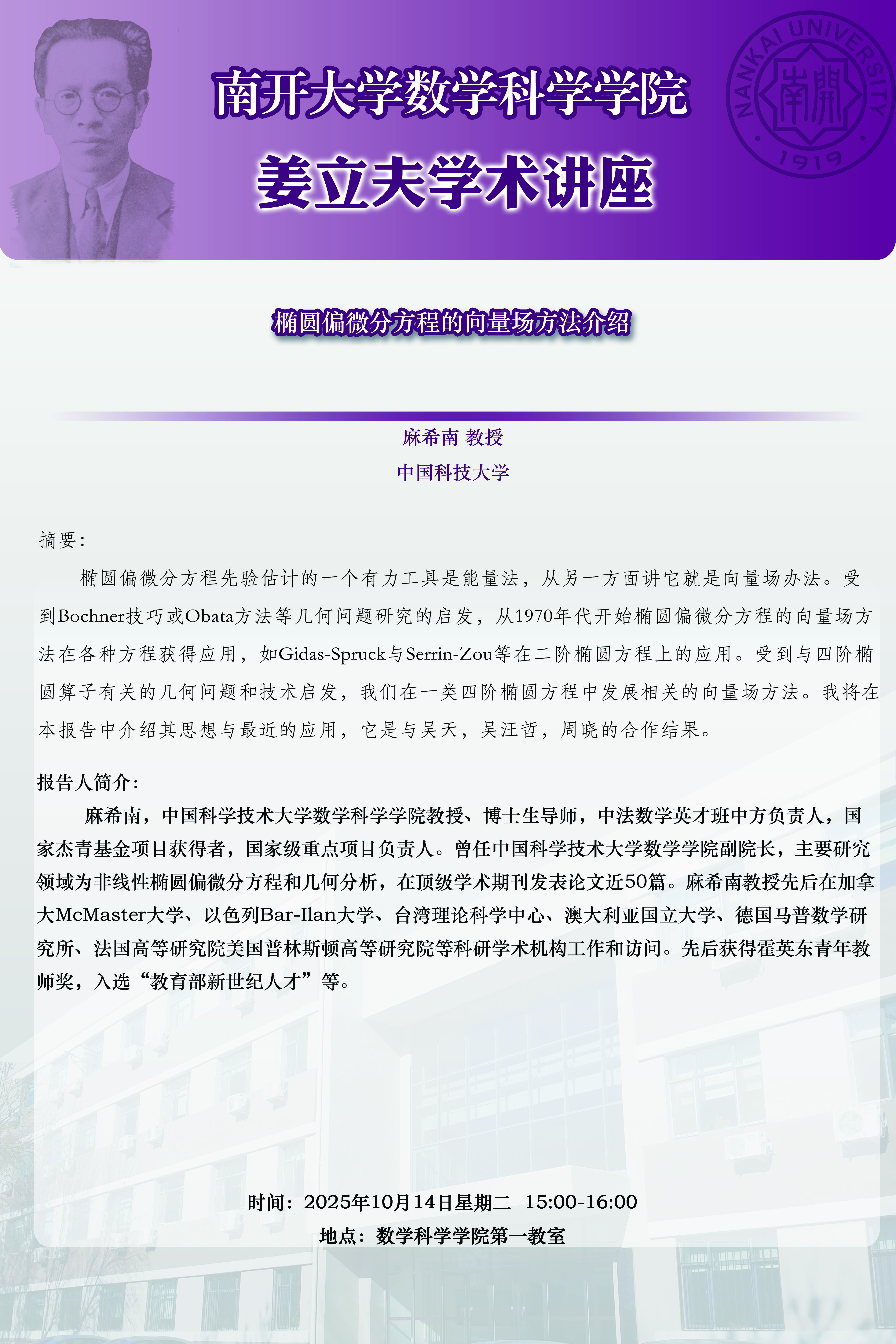 【姜立夫学术讲座】椭圆偏微分方程的向量场方法介绍